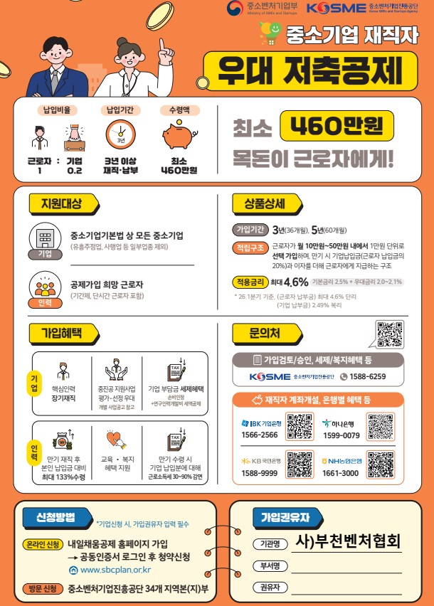 중소기업 재직자 우대 저축공제 댓글 0건 조회 22회 작성일 26-04-08 21:32 본문 중소벤처기업진흥공단에서 운영하는 「중소기업 재직자 우대 저축공제」 많은 관심과 가입 부탁드립니다. 목록 다음글사)부천벤처협회 2025년 5월 Work Shop 25.05.29 댓글목록 댓글목록 등록된 댓글이 없습니다.